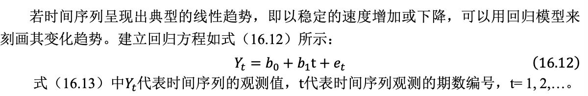 绘制时间序列的时间编号和观测值的散点图,在散点图中单击散点,单击右键,在弹出的列表中选择“添加趋势线…”,选择“线性”,勾选“显示公式”和“显示R平方值”,报告线性趋势方程。