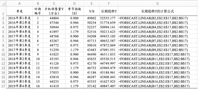 图16.29 FORECAST.LINEAR函数计算长期趋势的预测值