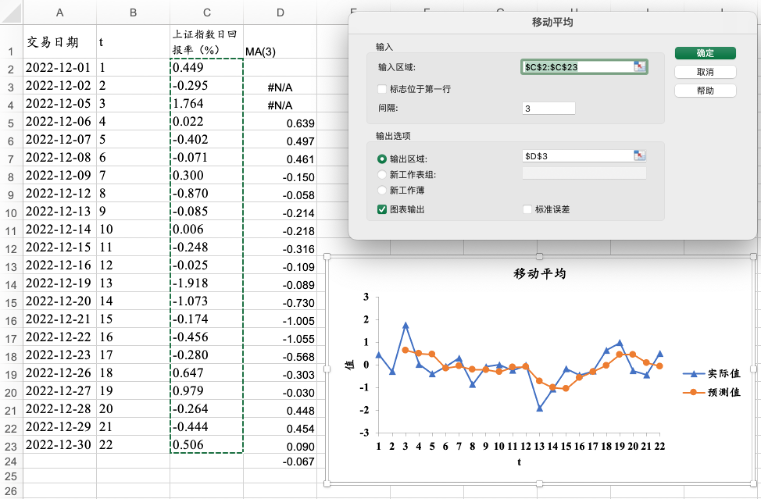 若使用最近3期观测值的平均值,作为下一期的预测,就称作3期移动平均,记作MA(3)。