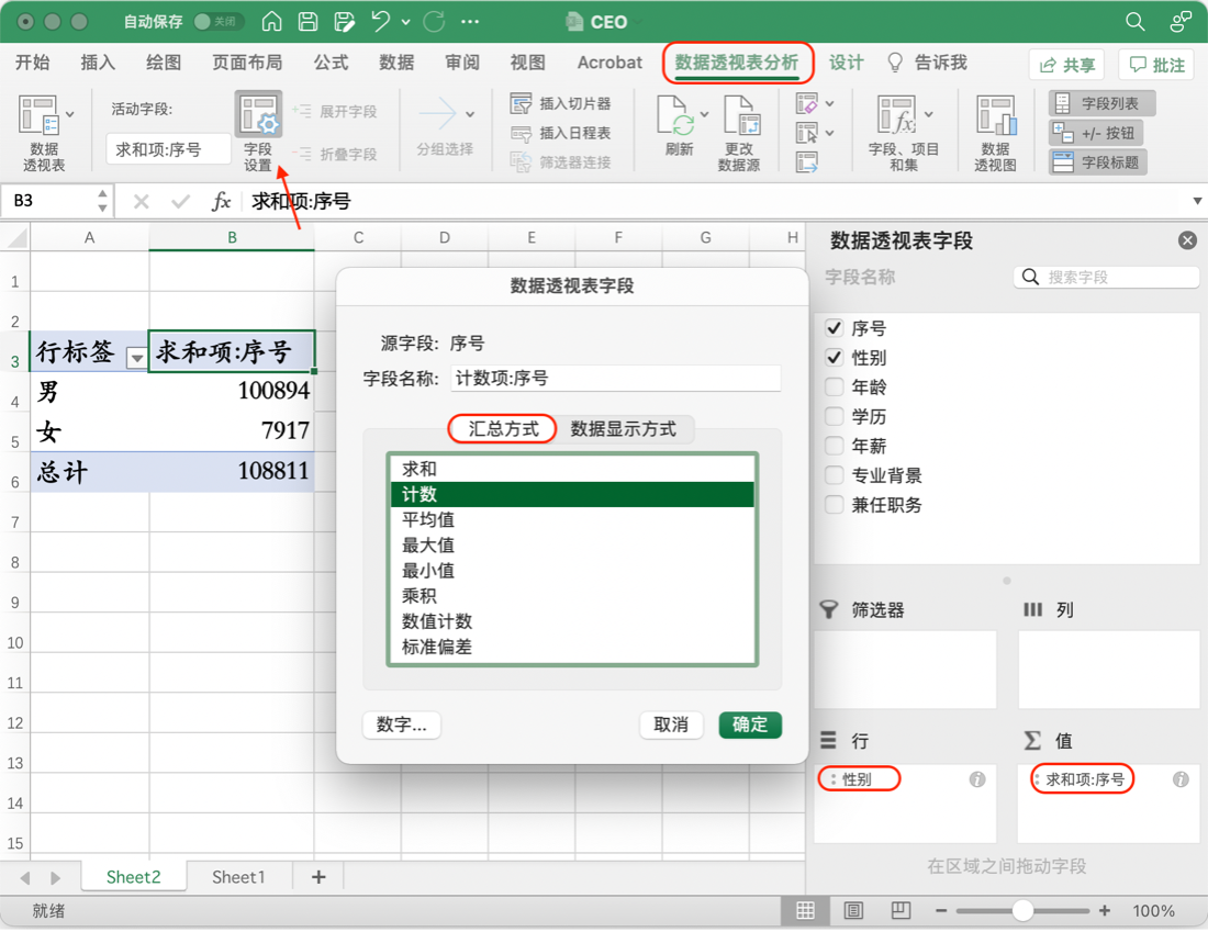 若拖曳到”Σ值”框中的字段是数字,如”序号”、“编号”,需要将”汇总方式”设置为”计数”,才能绘制频数分布表。