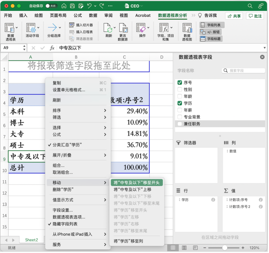 对于顺序数据,要注意数据透视表中各组排列顺序是否符合逻辑。若不符合,可单击右键,移动某个组别的位置。