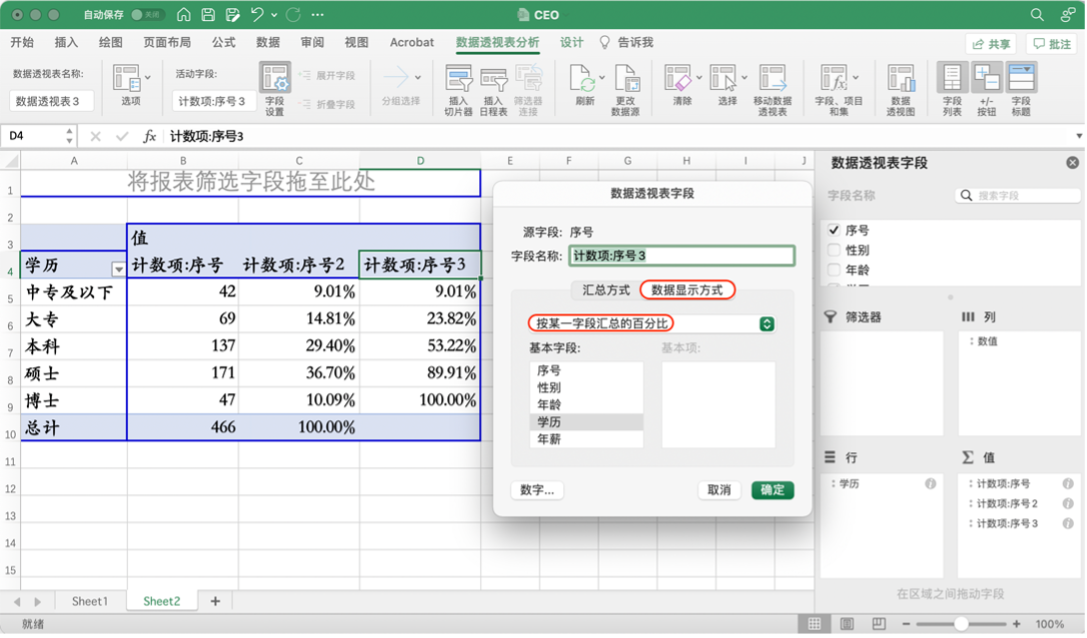 选中”计数项”,单击”字段设置”按钮,在”数据显示方式”中可选择报告百分比、累计百分比等。