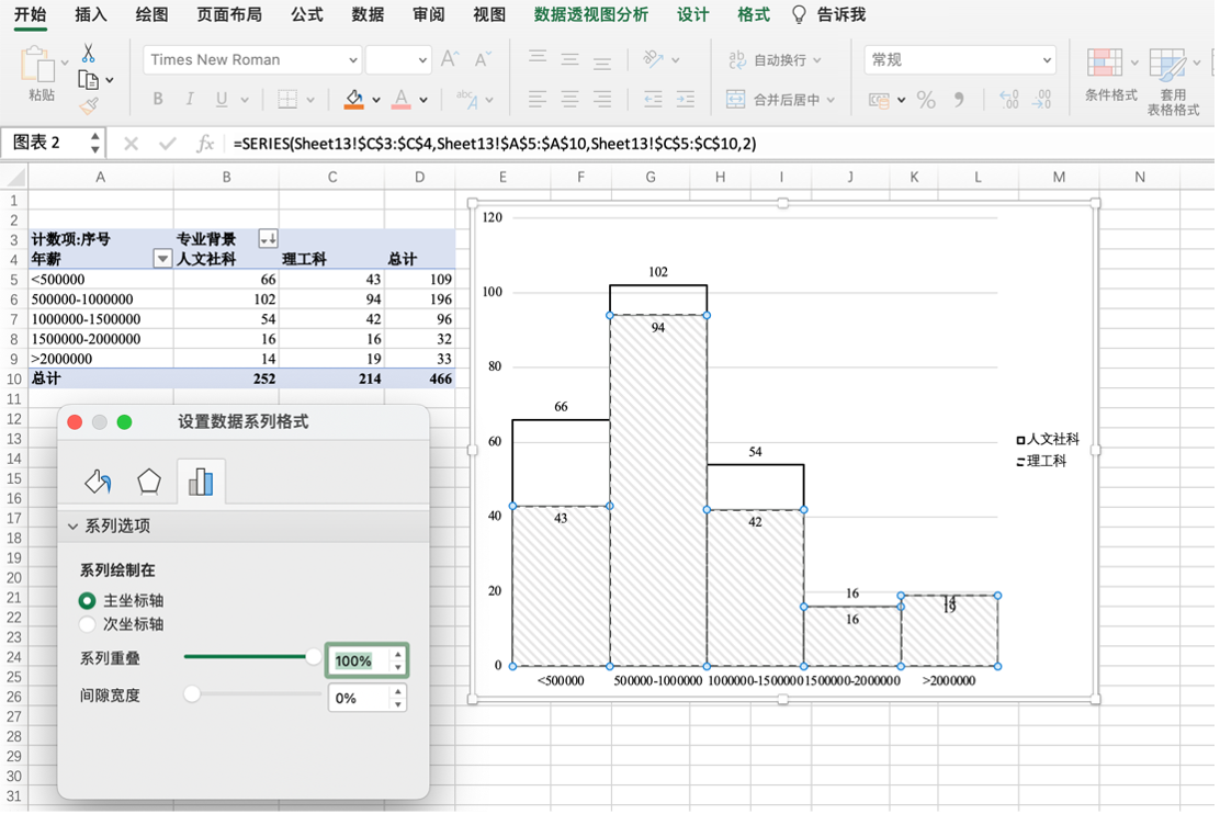 将“系列重叠”设置为100%,“间隙宽度”设置为0%,创建分组直方图