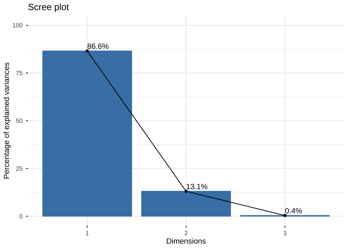 fviz_screeplot(res.ca, addlabels = TRUE, ylim = c(0, 75))#Coordinates of row pointsWarning in geom_bar(stat = "identity", fill = barfill, color = barcolor, :