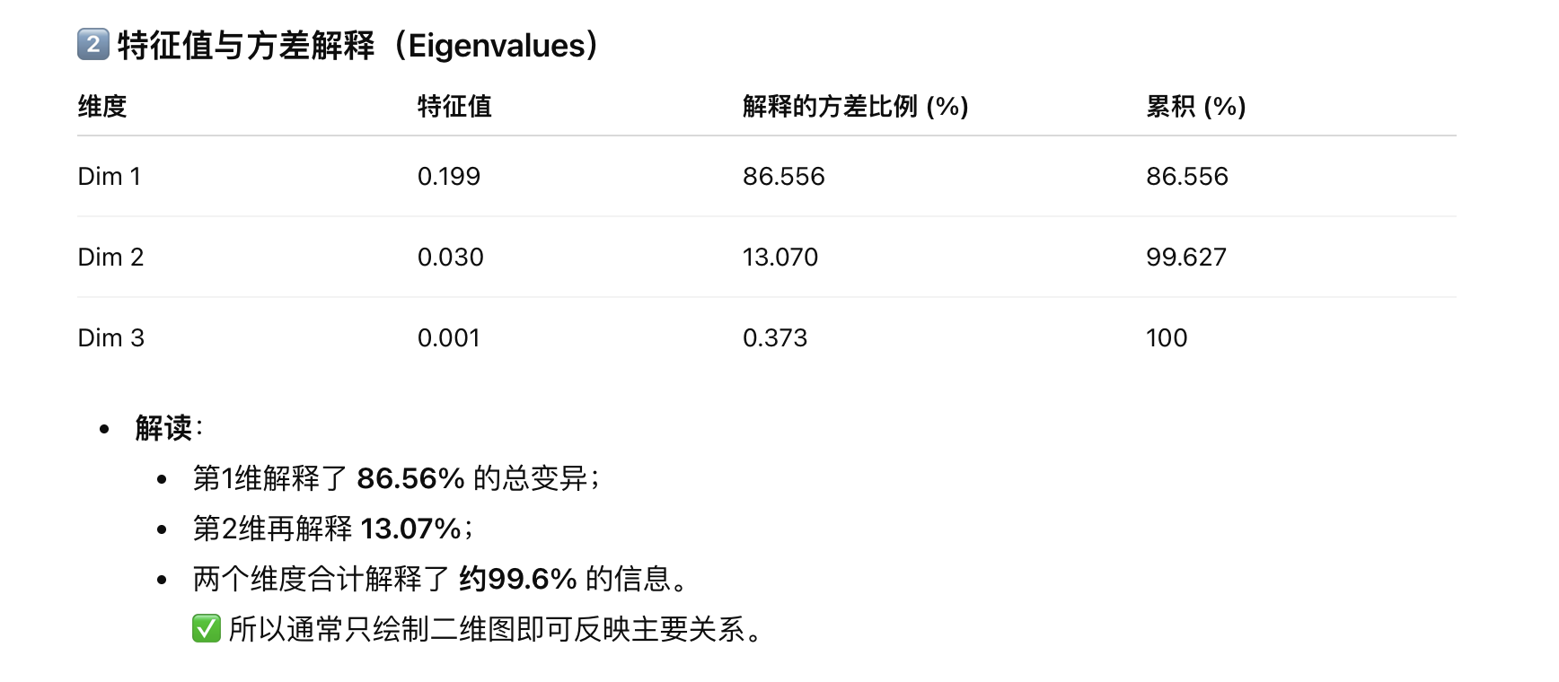 结论(定性):第一轴比第二轴解释的关联远多,是主要的结构方向;第二轴较弱,提供一些次要/补充信息。