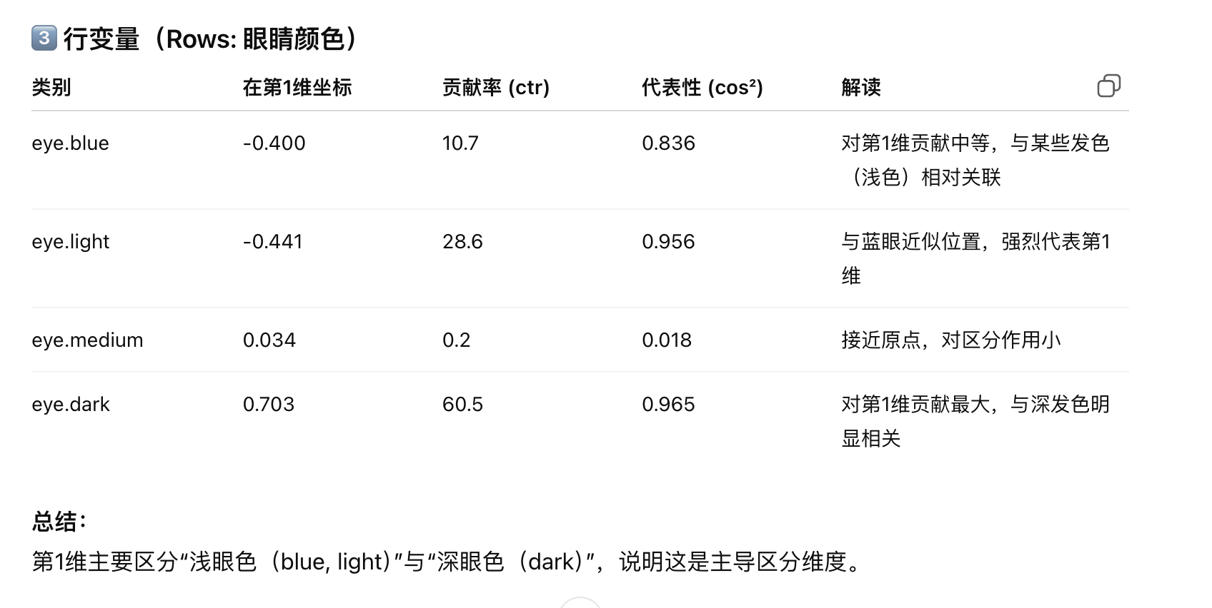 Row scores / Column scores 这两组表格分别是“行类别”(eye 的各水平)和“列类别”(hair 的各水平)在前两个主轴(canonical axes)上的坐标(scores)。