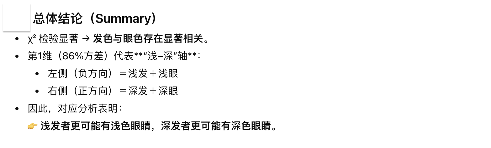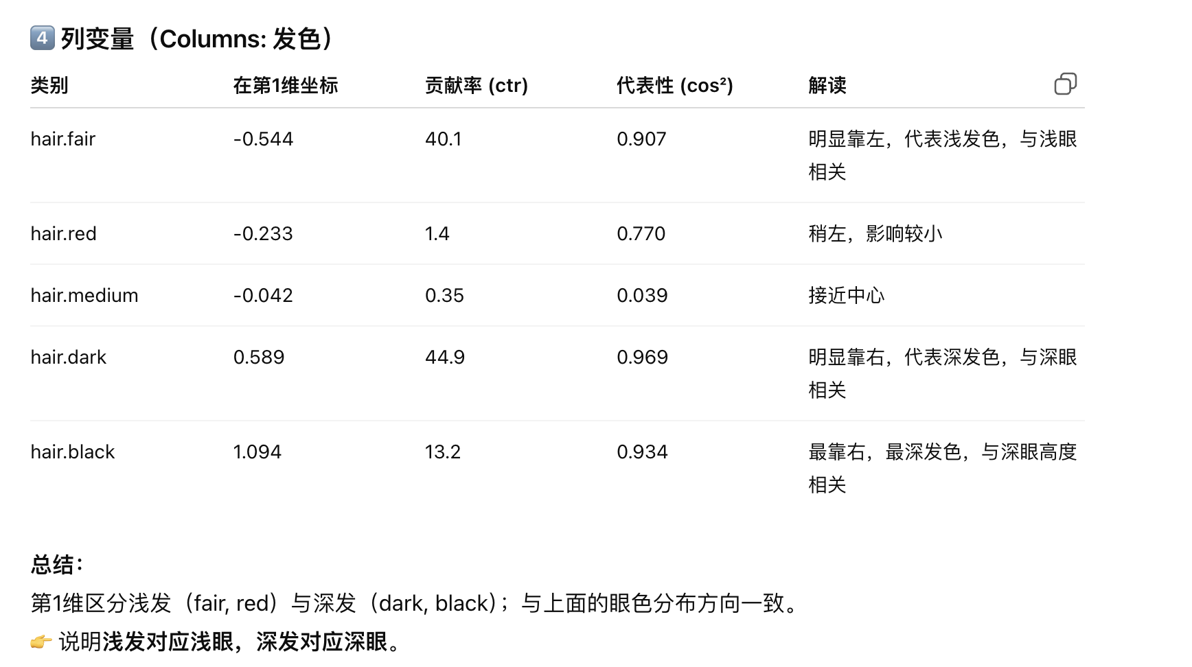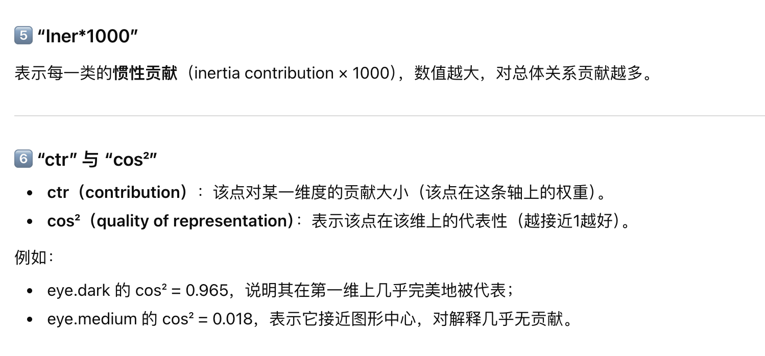 第一轴捕捉到的大约 19.9% 的“卡方变异”(或关联量),第二轴大约 3.0%。两轴合计约 22.9%(≈0.1992+0.0301)。