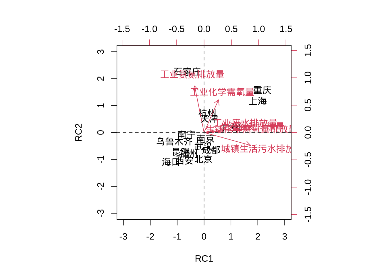 rownames(ex7_7) <- ex7_7$城市  fa.pc.varimax <- principal(ex7_7[-1], nfactors = 2,