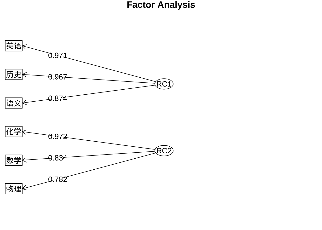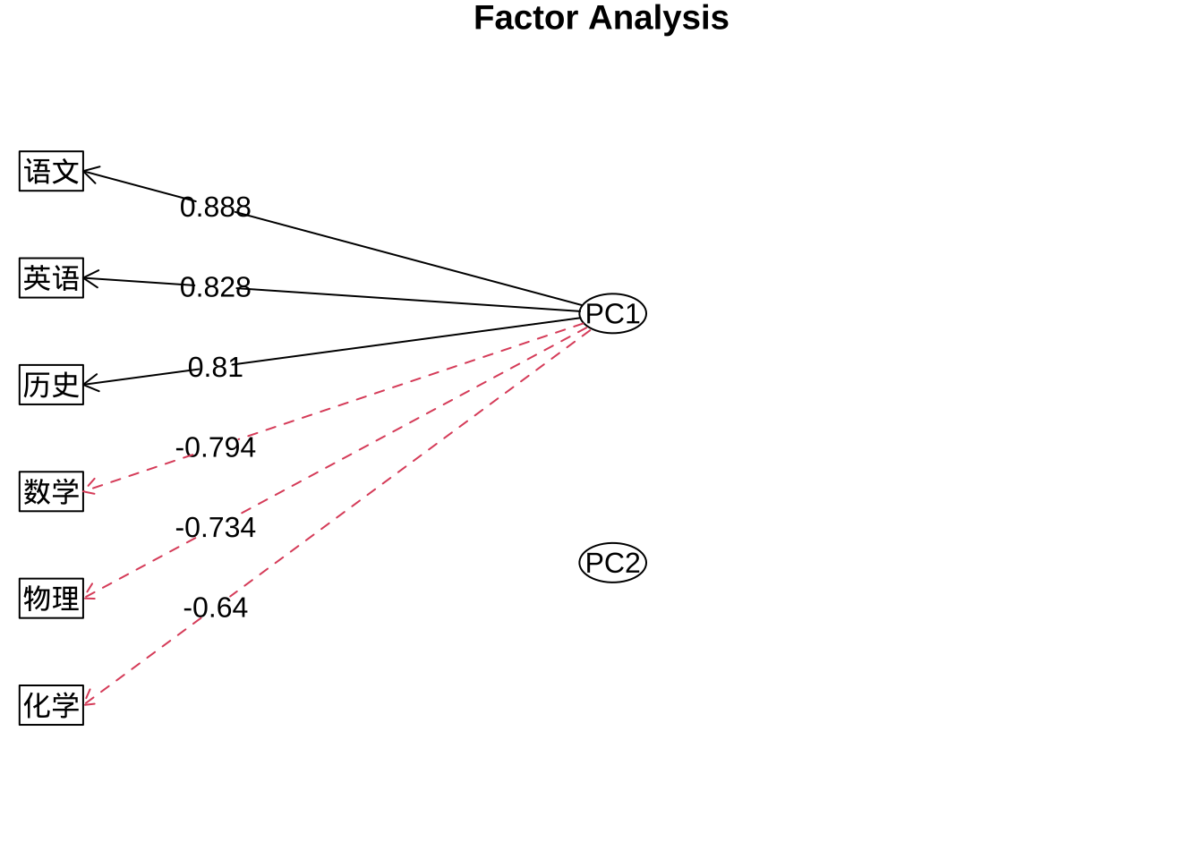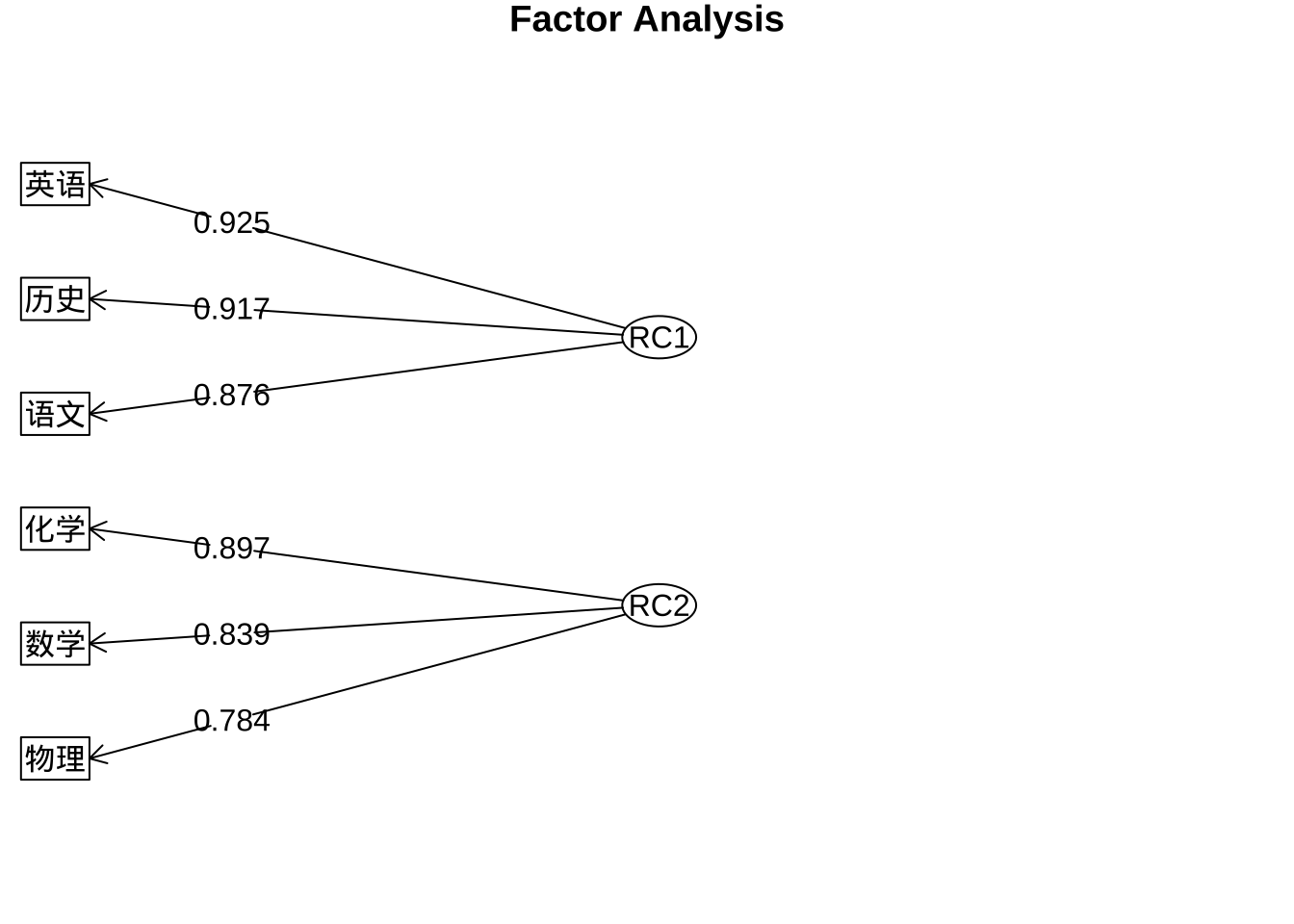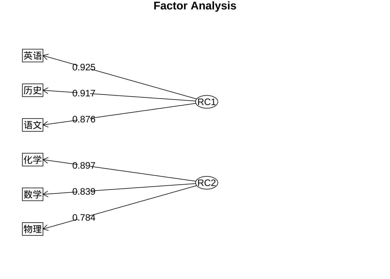- 每个变量被这两个公共因子共同解释的方差比例。比如 数学 的 h2 = 0.81,表示两个公共因子可以解释数学 81% 的方差;剩下 19%(u2)是变量的独特方差或噪声。