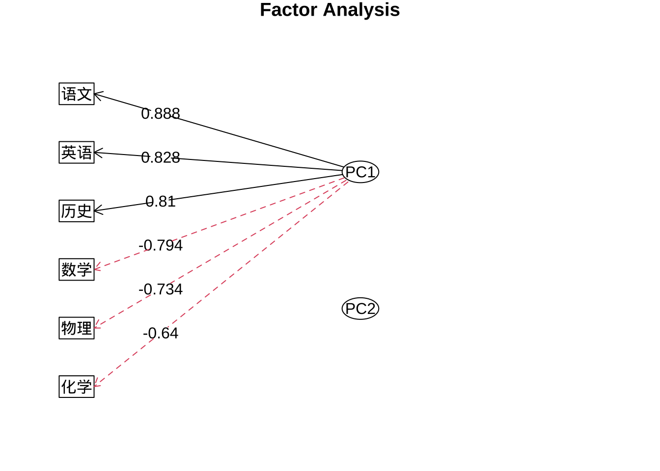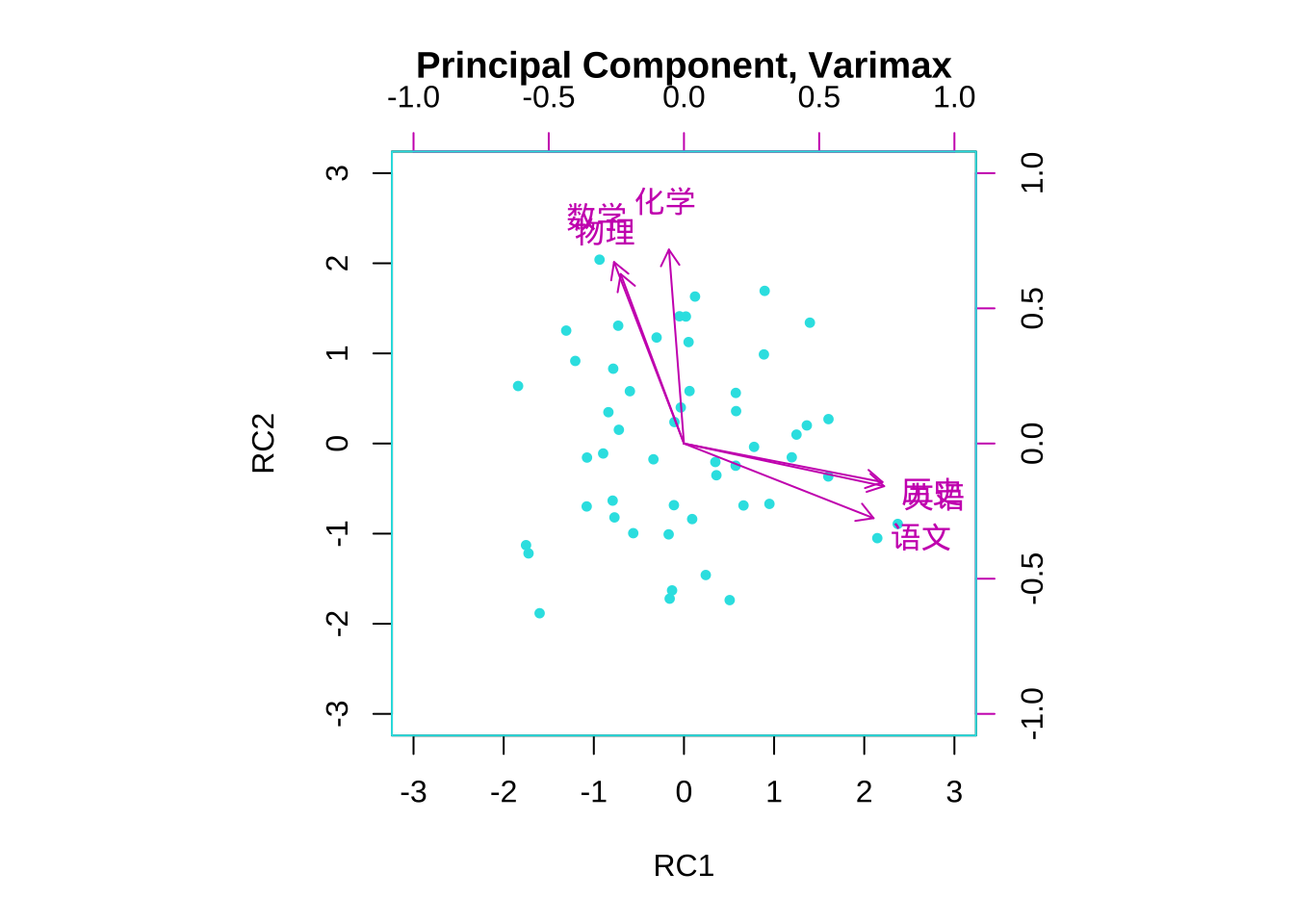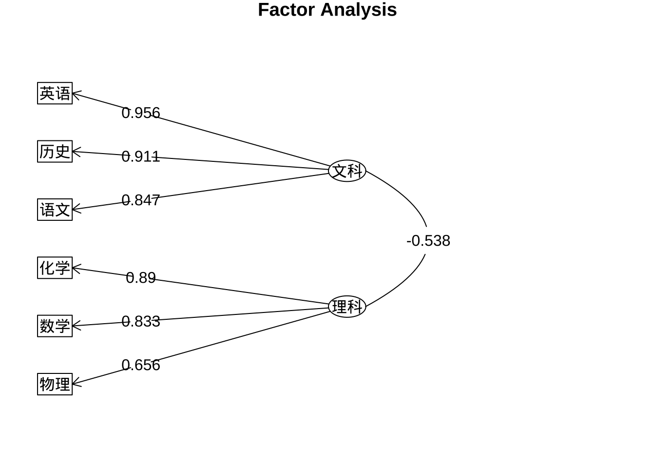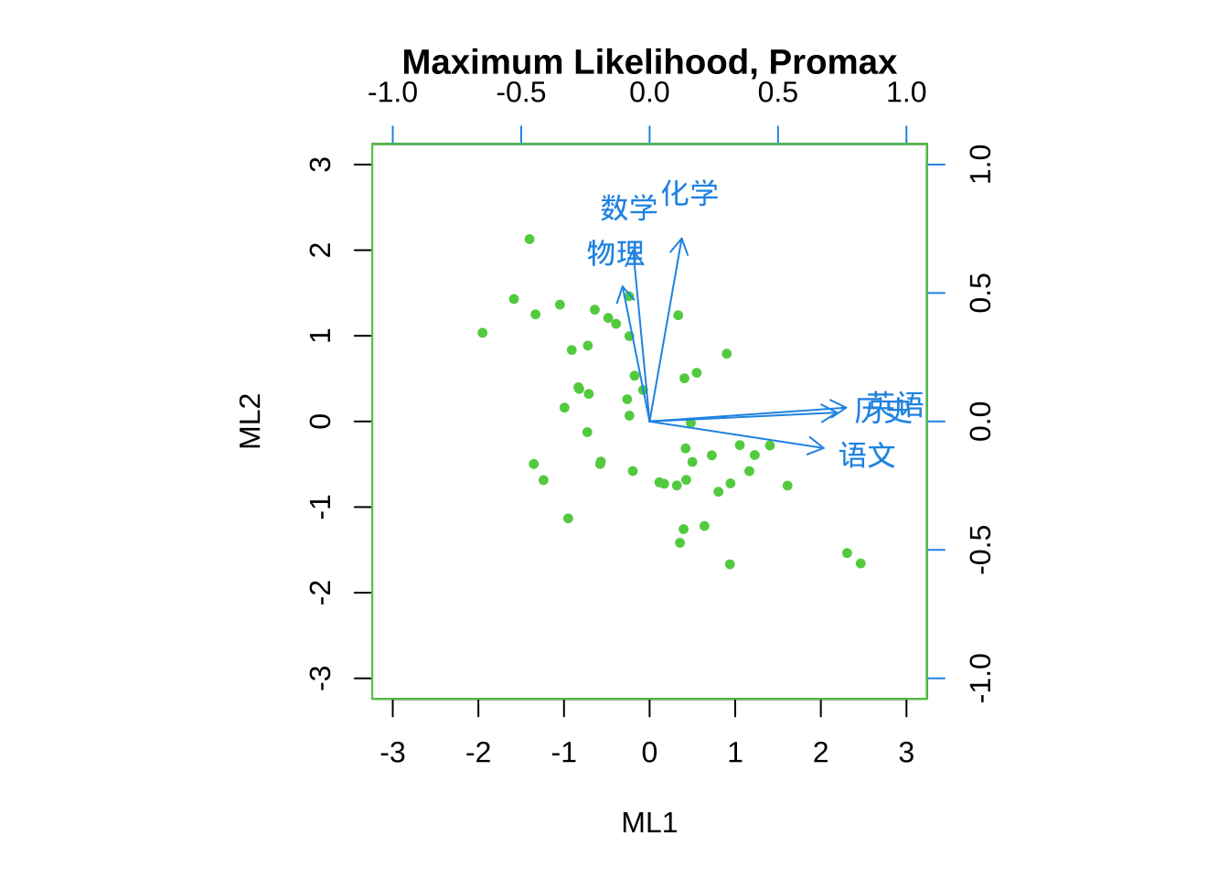 colnames(fa.pc.varimax$loadings) <- c("文科", "理科")#maximum likelihood 极大似然 斜交旋转promax