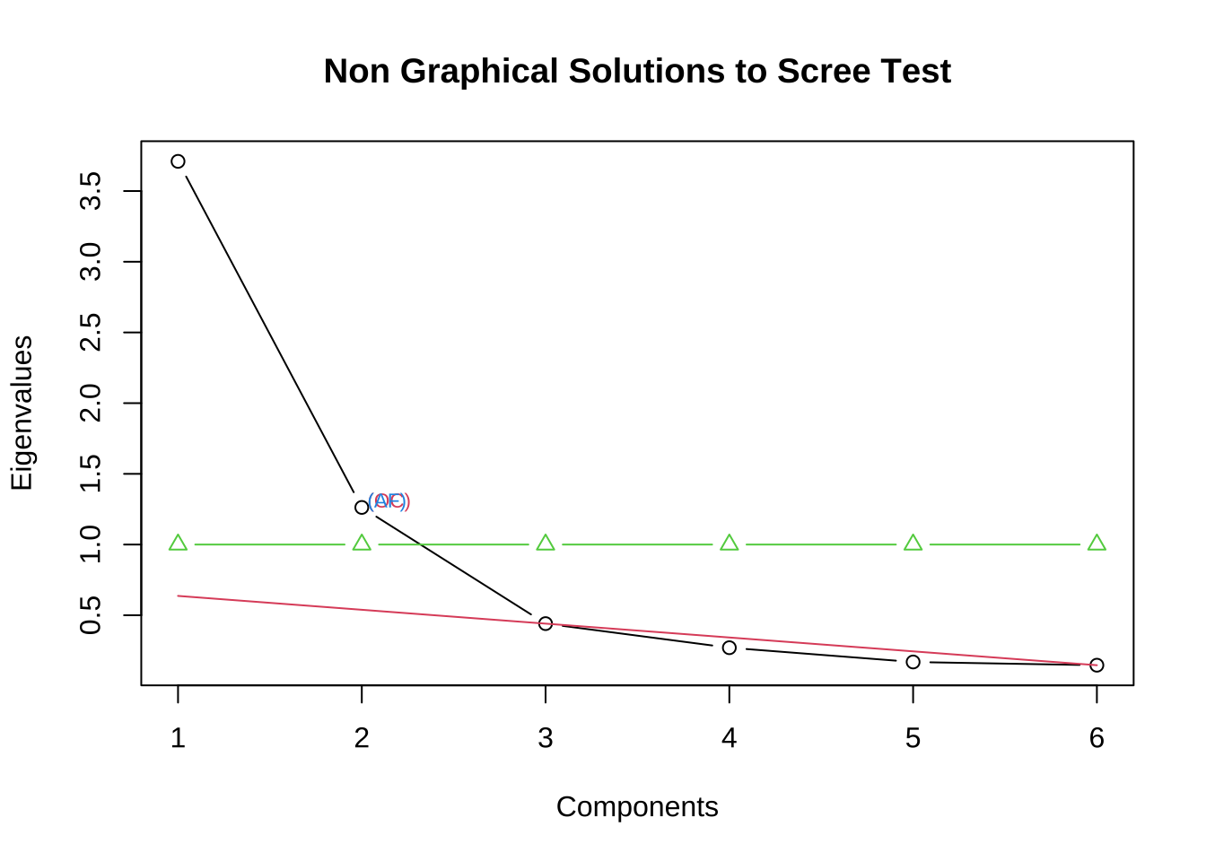 SS loadings 为 3.71 和 1.26,p = 6(因为用相关矩阵)。