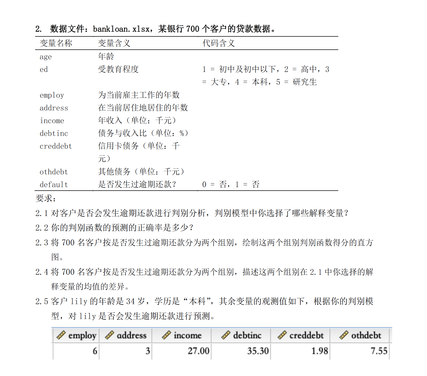 两个组别的差异: 未逾期(default = 0)和有逾期(default = 1)相比,整体而言,未逾期(default = 0)的组别年龄更大,在当前雇主的服务时长更长、在当前居住地居住时间更长、收入更高、债务与收入比更低、信用卡债务和其他债务更低。