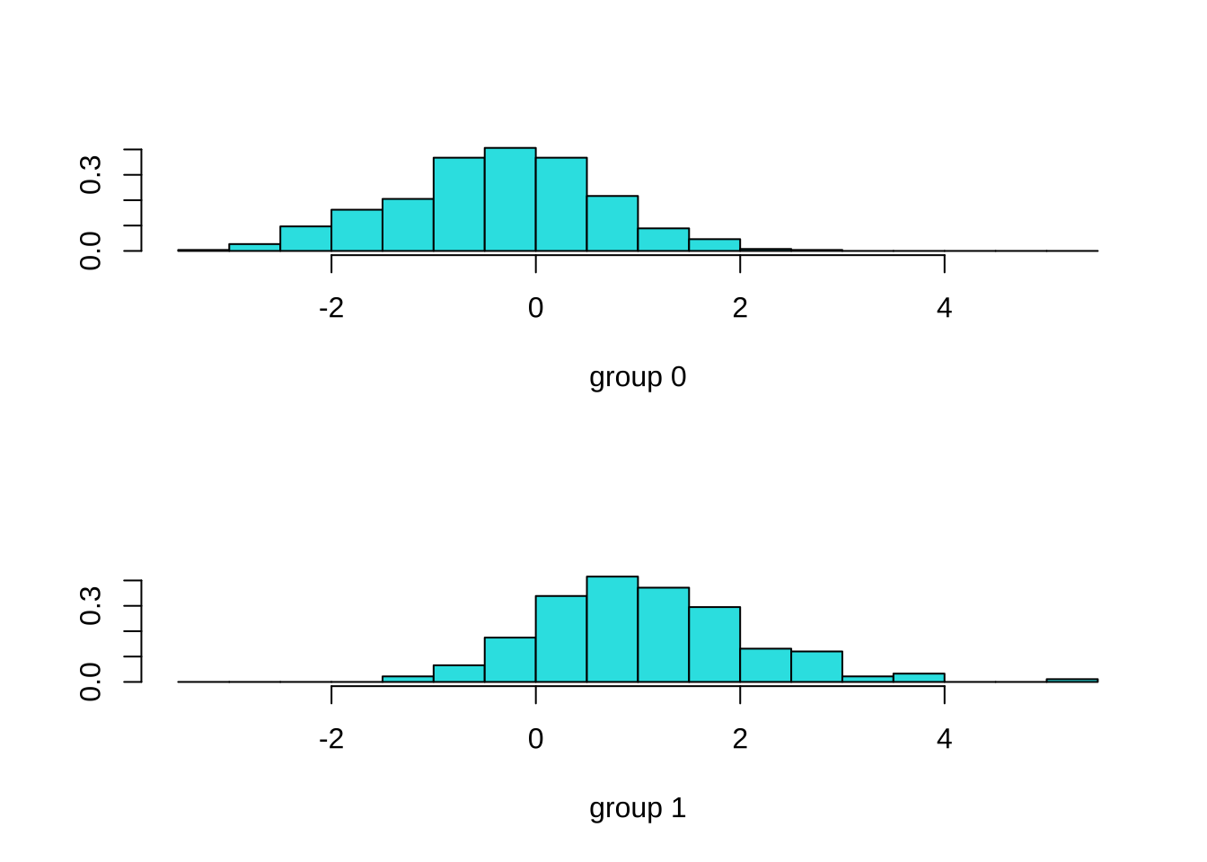 ldahist(model1.predict$x,bankloan$default)