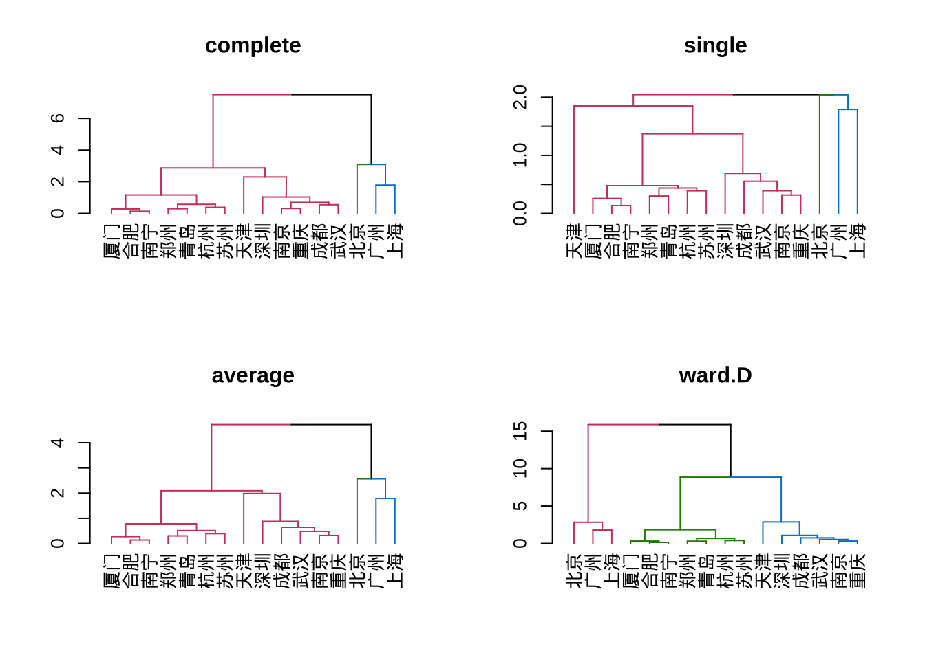 #对比四种聚类方法的树状图